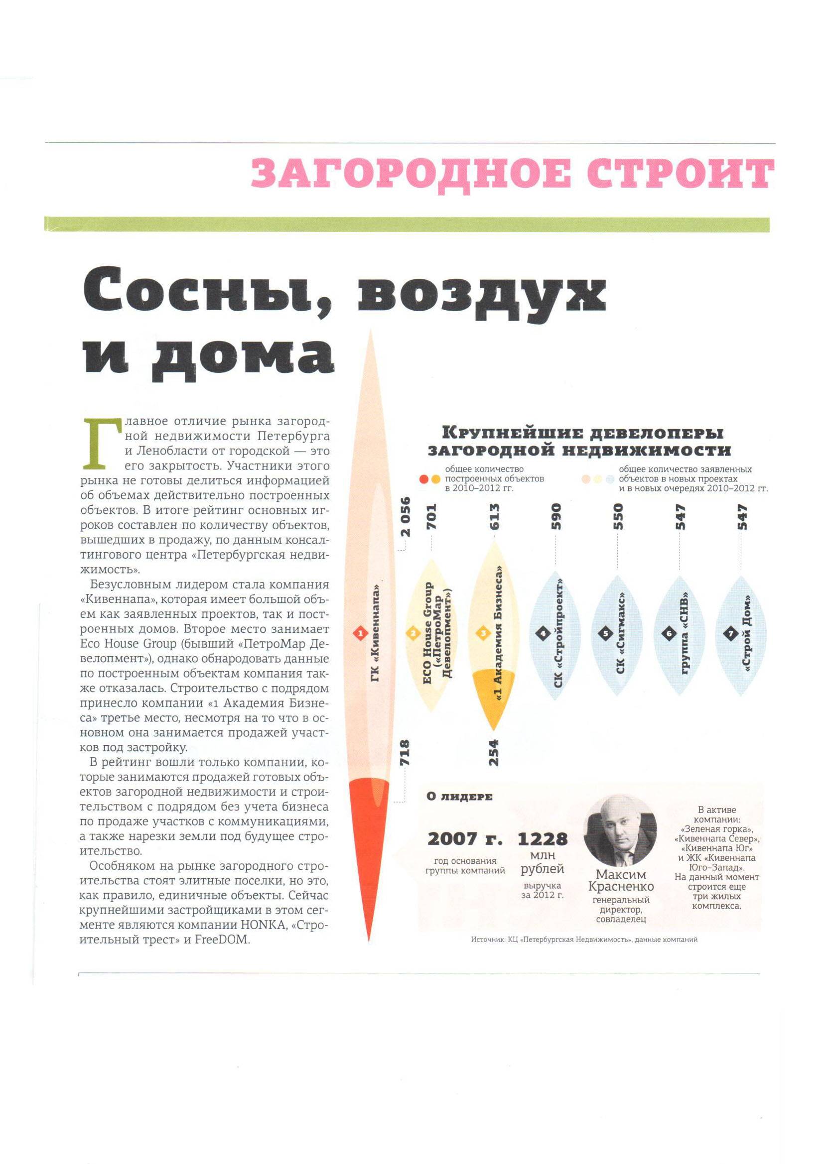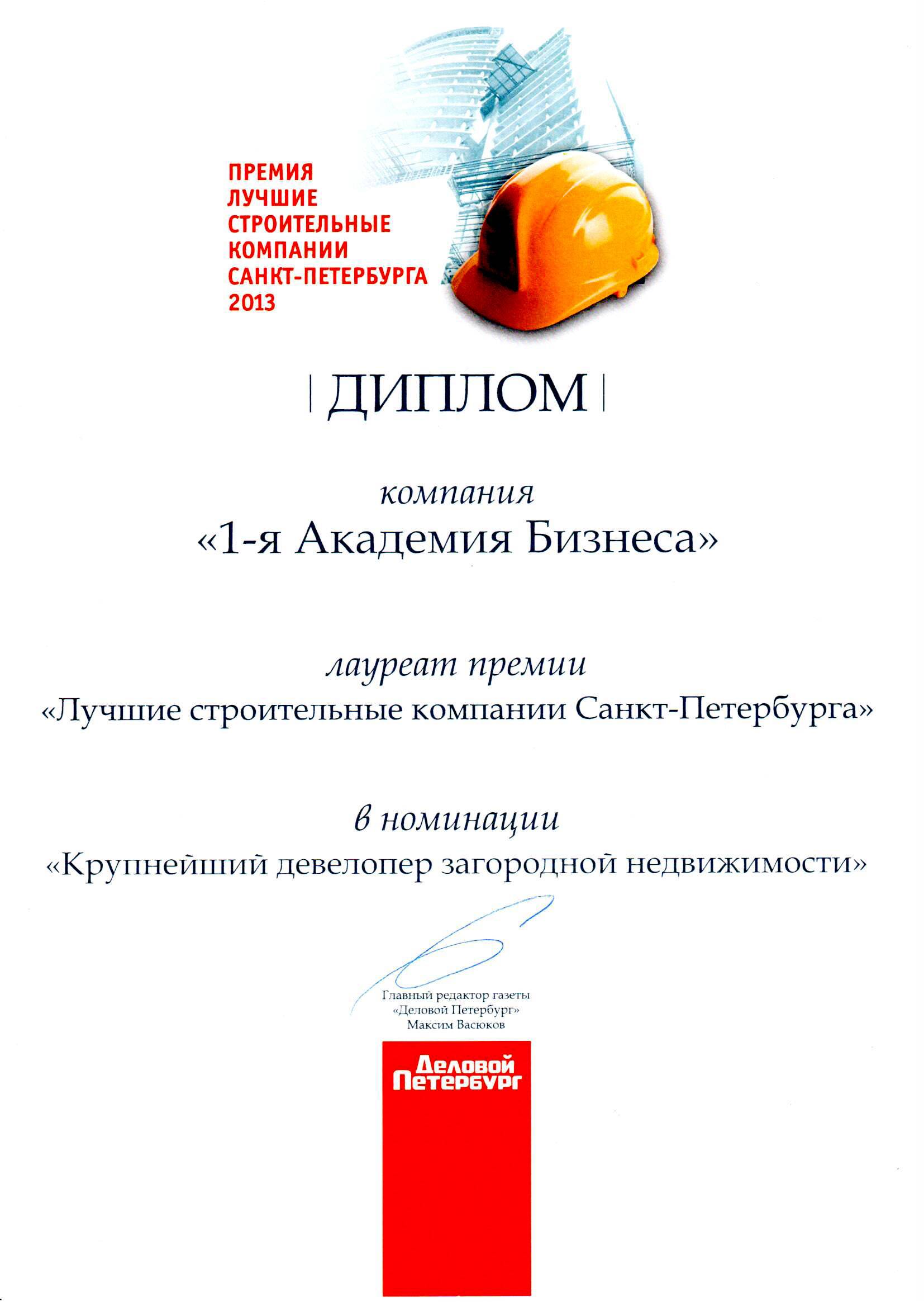 Группа компаний 1-я Академия бизнеса, включающая дивелоперовскую и риэлтерскую компанию "1-я Академия недвижимости" и управляющие компании ООО "1-й Земледелец" и ООО "2-й Земледелец" и др, стала лауреатом премии "Лучшие строительные компании Санкт-Петербурга" в номинации "Крупнейший девелопер загородной недвижимости" .